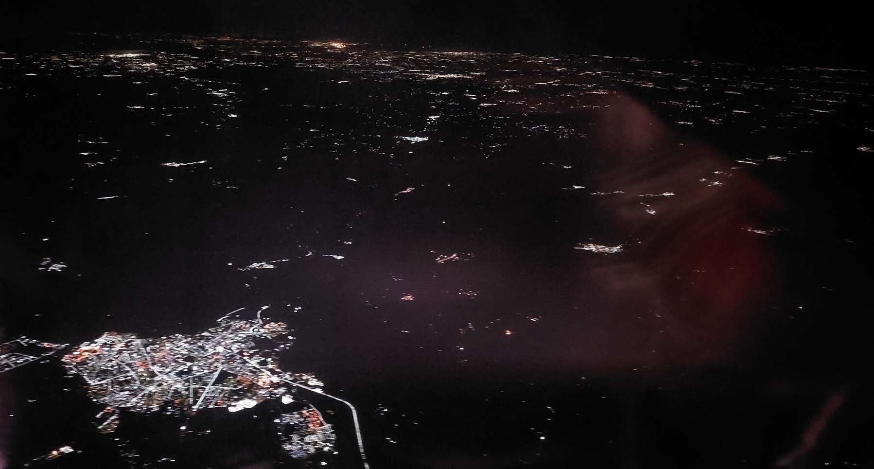 The overnight flight to Johannesburg began with a connection through Paris, two hours in the opposite direction. We then flew back within view of Barcelona again and onward across the Mediterranean, reaching the African continent over Algeria. The bright coastal cities there soon gave way to the pitch darkness of the Sahara desert.