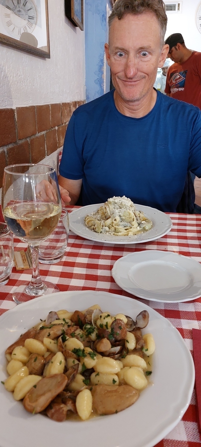 In Rome we had time for a lunch of fresh pasta and white wine. Then we boarded a second train of less glamor to continue down the boot of Italy. There were no cold drinks and, desperate for beer, Lee ran off the train at Foggia! He returned with four cold ones to a hero’s welcome.