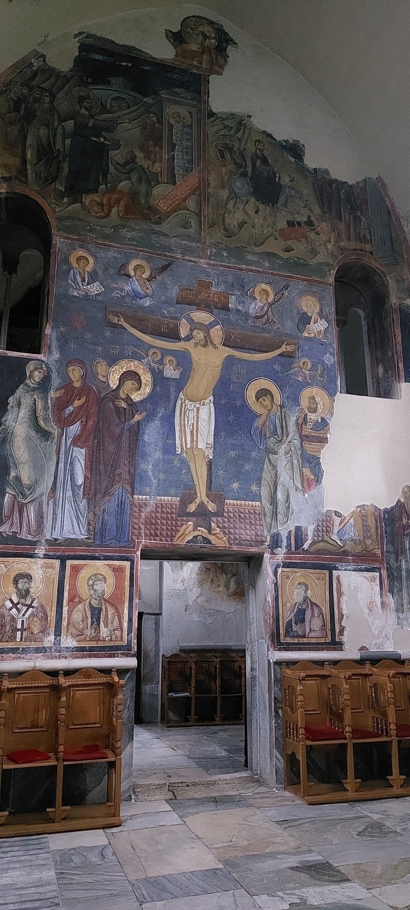 Wed 1 May - We started with a hike up foggy, dry ski slopes. Then we started driving toward Tara National Park. We encountered historic Studenica Monastery. On arrival in Užice we searched an hour for our booked apartment: it had a different name and address. We’re learning that this is normal here.